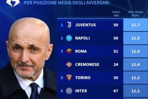 体育资讯3月11日讯 德国转会市场统计了意甲各队剩余10轮对手的平均排名,并列出榜单,尤文的对手平均排名最低。