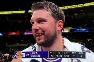 体育资讯3月26日讯 NBA常规赛,湖人客场137-130击败步行者,东契奇赛后在场边接受了媒体采访。