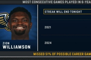 锡安缺席了生涯51%的比赛