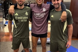 姆巴佩晒出了与皇马体能教练Sébastien Devillaz和理疗师Willy Zurdo的合照,配文写道:“一切全看努力。💪🏽”