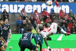 比赛开场15分钟,科隆前锋阿赫接到马拉的传中,在禁区内上演了一记非常精彩的倒挂金钩破门,凌空的动作非常舒展!